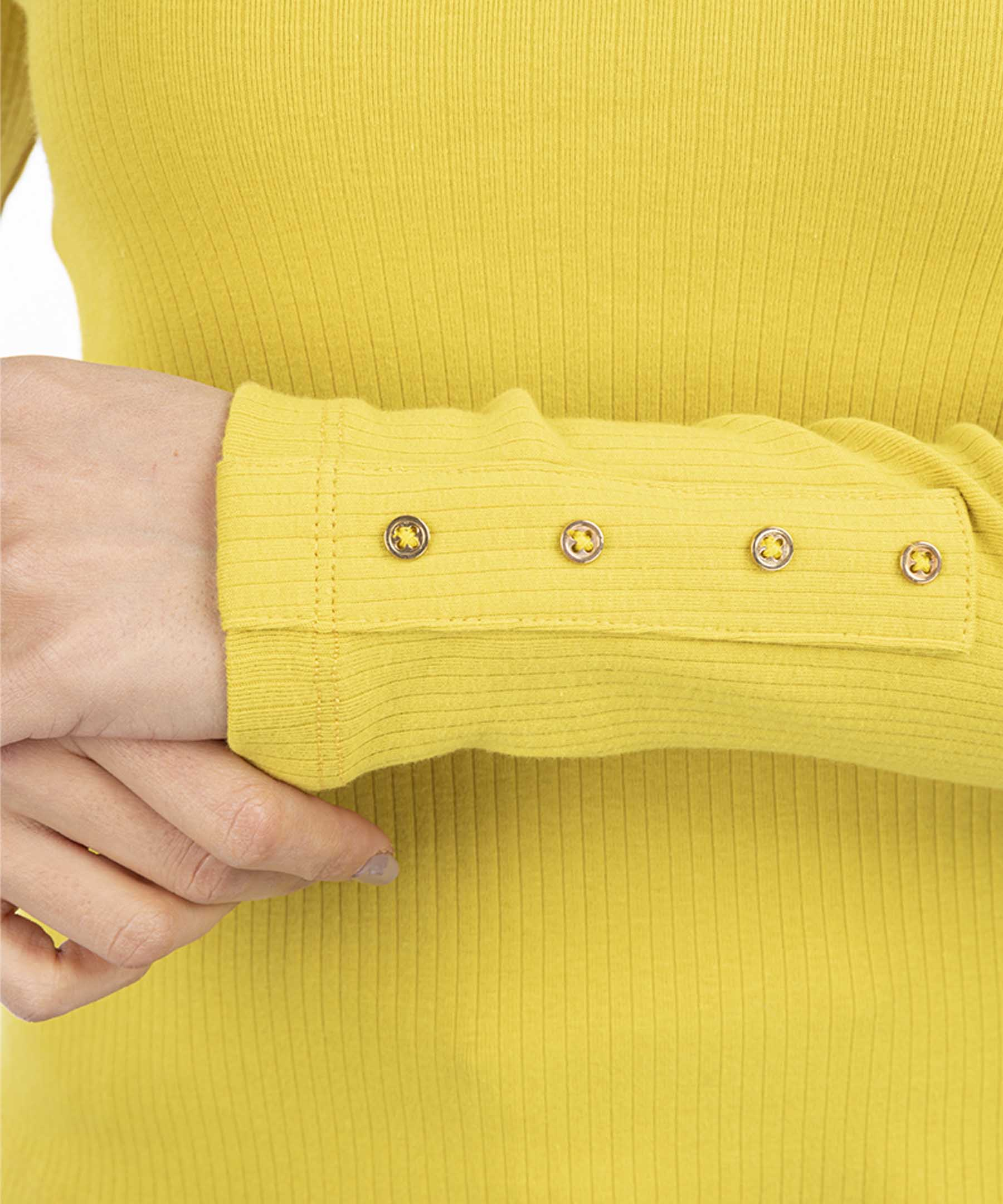 جزئیات مدل: یقه گرد باز، دور یقه کشباف، یک ردیف دکمه تزیینی سرآستین
