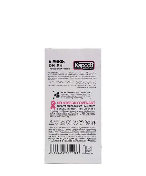 آیا میخواهید تجربهای متفاوت و طولانیتر در رابطهتان داشته باشید؟ کاندوم تاخیری Kapoot مدل Viagris Delay با تکنولوژی پیشرفته خود، زمان اوج لذت را به تعویق میاندازد و تجربهای استثنایی برای شما و شریک زندگیتان فراهم میکند. با بسته 12 عددی، لحظات بیشتری از عشق و آرامش را تجربه کنید. همین حالا خرید کنید و از لذت بیشتری بهرهمند شوید!