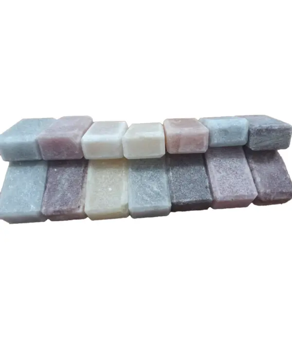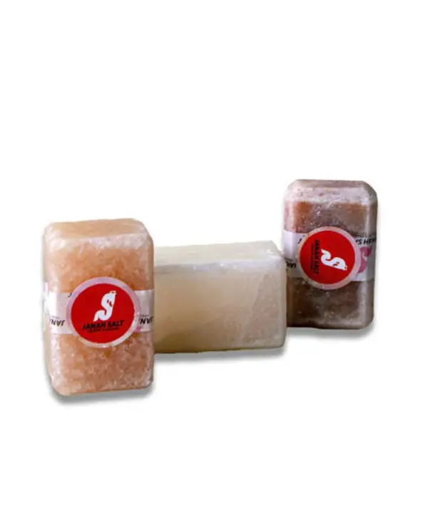 سنگ پا نمک جناح به صورت بلوکهای مستطیلی با گوشههای کمی گرد شده، شبیه به قالبهای صابون، طراحی شده است. این بلوکها در رنگهای متنوع و زیبای طبیعی سنگ نمک از جمله صورتی، نارنجی روشن، سفید، قهوهای، خاکستری و بنفش کمرنگ عرضه میشوند. بستهبندی ساده و مینیمالیستی آن، با یک نوار و برچسب برند «JANAH SALT»، بر اصالت و طبیعی بودن محصول تأکید دارد.